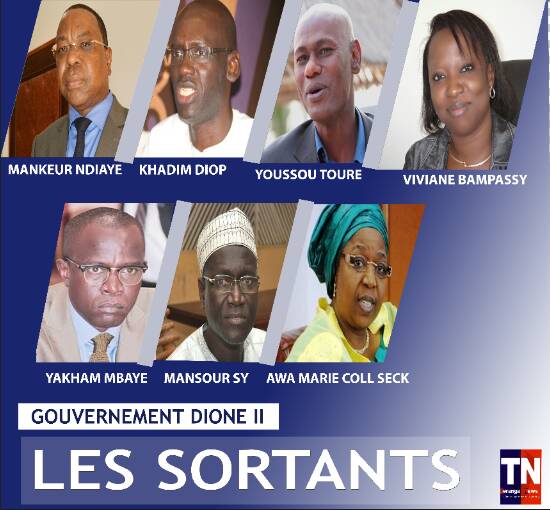 Ils sont au nombre de 7, tous faisaient partie du 3ème gouvernement du Président Macky Sall. Mais ils ont été remerciés et remplacés dans l’équipe de « Dionne bis ». Les sortants comptent 5 ministres et 2 secrétaires d’État. Il s’agit de Mankeur Ndiaye, Khadim Diop, Viviane Bampassy, Mansour Sy, Awa Marie Coll Seck respectivement Minstre des affaires étrangères, Ministre de l’intégration africaine, en charge du NEPAD, Ministre de la Fonction publique, Ministre du Travail et Ministre de la Santé du 3ème gouvernement. Pour ce qui est des deux secrétaires d’État, c’est Youssou Touré, secrétaire d’État à l’alphabétisation et Yakham Mbaye, secrétaire d’État à la communication.
