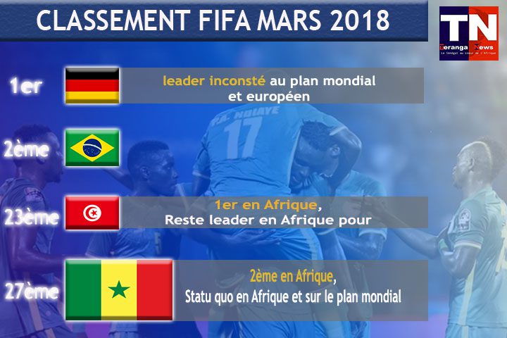 La FIFA a rendu public son classement mondial masculin du mois de février. Le Sénégal garde sa deuxième place Afrique derrière la Tunisie. Depuis 3 classements maintenant que les Aigles de Carthage occupent cette position notamment, à leur qualification en Coupe du Monde. Ils avaient détrôné les hommes d’Aliou Cissé du toit de l’Afrique. Le Sénégal est quant à lui resté le numéro 2 en Afrique.