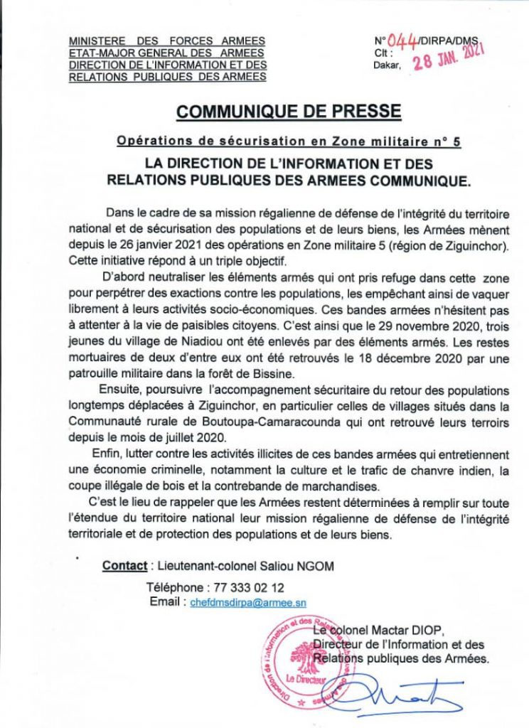 Dans un communiqué daté de ce jeudi 28 janvier 2021, la Grande Muette dit s’être fixée trois (03) objectifs en procédant aux opérations de ratissage le long de la frontière sud du Sénégal, notamment celle avec la Guinée-Bissau, qui ont commencé il y a 48 heures, soit depuis « le 26 janvier » dans la zone militaire n°5, correspondant à la région administrative de Ziguinchor.