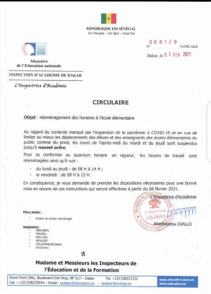 « Au regard du contexte marqué par l’expansion de la pandémie Covid-19 et en vue de limiter au mieux les déplacements des élèves et des enseignants des écoles élémentaires du public comme du privé, les cours de l’après-midi du mardi et du jeudi sont suspendus jusqu’à nouvel ordre », a-t-elle notamment exposé. Ainsi, dit-elle, pour se conformer au quantum horaire en vigueur, les classes seront ouvertes de 8 h à 14 h, du lundi au jeudi et le vendredi, ce sera de 8 h à 13 h.