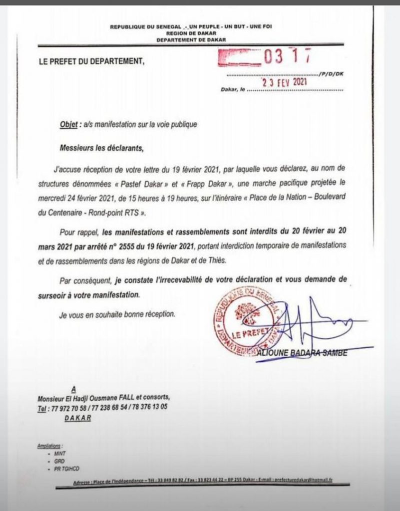 le préfet de Dakar décide d’interdire la marche de Frapp-Pastef prévue ce mercredi 24 février 2021, à la Place de la Nation ex l’Obélisque. Les membres du parti d’Ousmane Sonko, alliés aux camarades de Guy Marius Sagna, prévoyaient de faire une marche pacifique pour la libération de Souleye Diop, Fatima Mbengue, Patricia Diop ainsi que leurs 19 camarades arrêtés à Bignona, en Casamance.