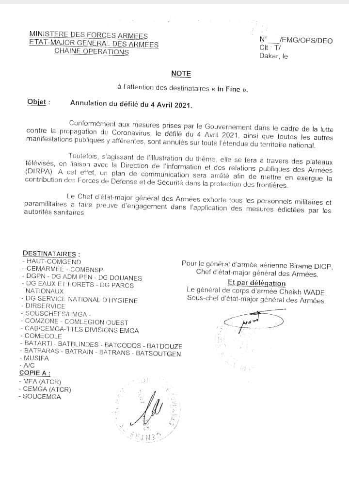 « Le défilé du 4 avril ainsi que toutes les manifestations publiques y afférentes n’auront pas lieu cette année sur tout l’ensemble du territoire national », selon L’Observateur qui donne la nouvelle dans sa livraison du jour. En revanche , le thème du défilé sera débattu sur les plateaux de télévision, en liaison avec la DIRPA.