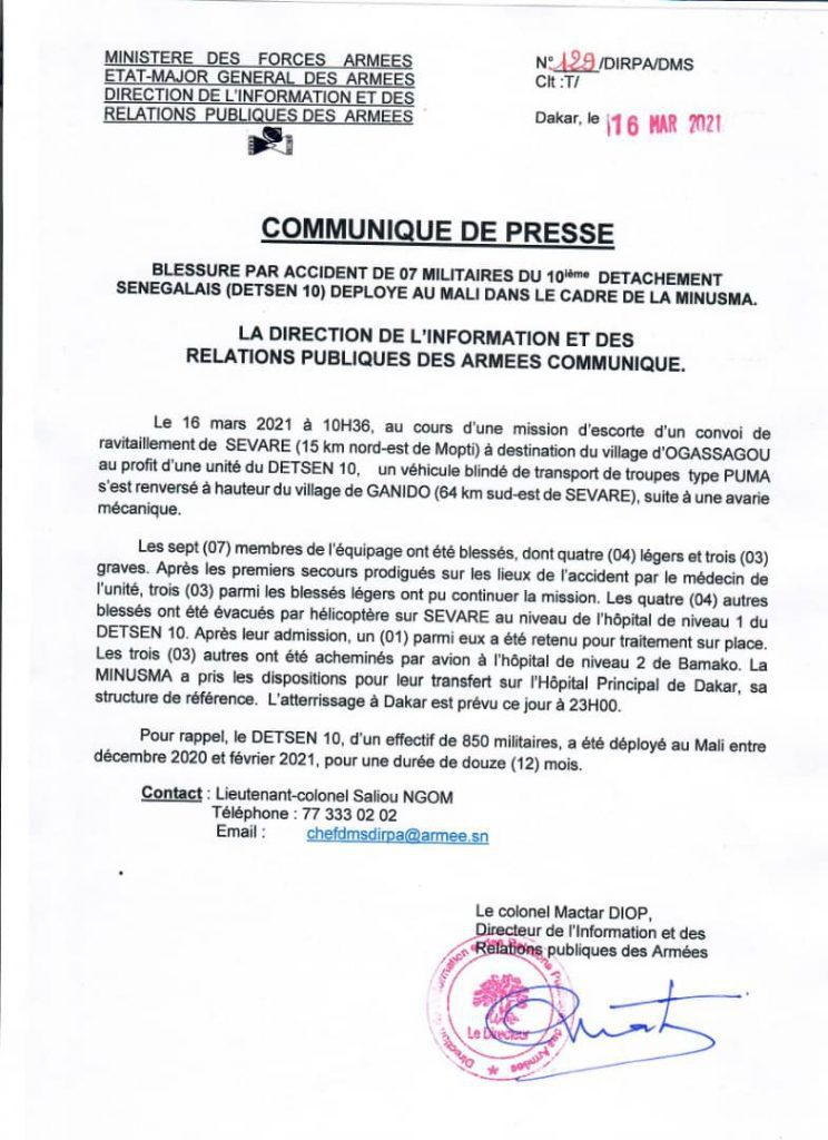 Sept (7) militaires sénégalais ont été blessés, dont quatre légers et trois graves, ce lundi 16 mars 2021, au cours d’une mission d’escorte d’un convoi de ravitaillement de SEVARE à destination du village d’Ogassagou (Mali), au profit d’une unité du DETSEN 10, renseigne un communiqué de la Direction de l’information et des relations publiques des armées.