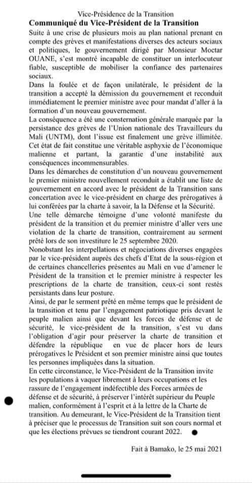 Il estime que la liste du nouveau gouvernement a été établit sans concertation avec le vice-président, en violation de la Charte de la transition.