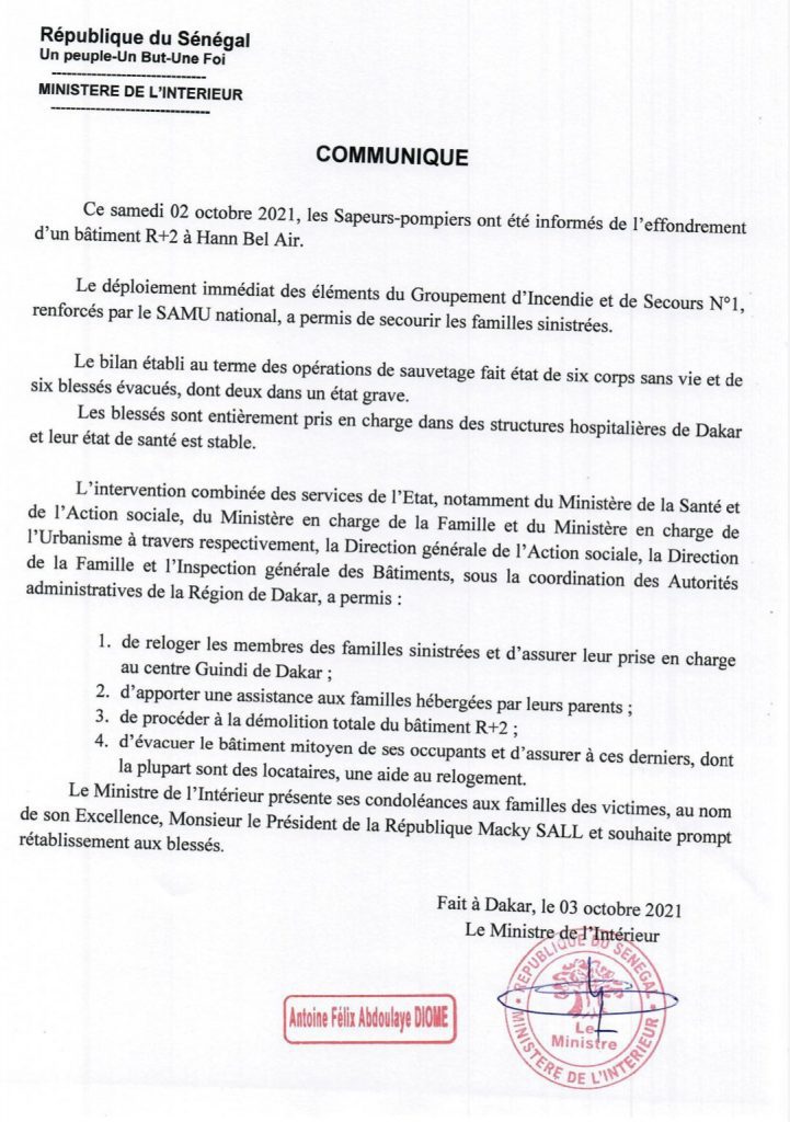 «L’intervention combinée des services de l’Etat, notamment du ministère de la Santé et de l’Action sociale, du ministère en charge de la Famille et du ministère en charge de l’Urbanisme à travers respectivement, la direction générale de l’Action sociale, la direction de la Famille et l’inspection générale des bâtiments, sous la coordination des autorités administratives de la région de Dakar, a permis de reloger les membres des familles sinistrés et d’assurer leur prise en charge au centre Guindi de Dakar», indique le document signé par le premier flic du pays.