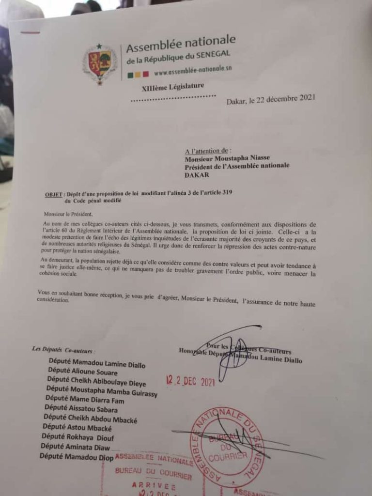 Une proposition de loi modifiant l’article 319 de la loi n° 65-60 du 21 juillet 1965 portant Code pénal, initiée par le collectif And Samm Jikko-Yi, et portée par une quinzaine de députés, a été déposée hier mercredi à l’Assemblée nationale. Selon les initiateurs de cette proposition, l’objectif visé est de durcir encore plus les sanctions pénales prévues pour les actes contre-nature que sont l’homosexualité, le lesbianisme, la bisexualité, la transsexualité, entre autres.