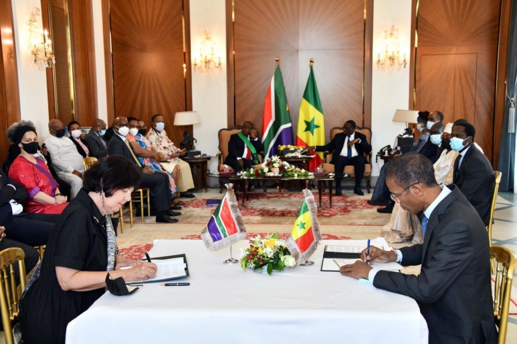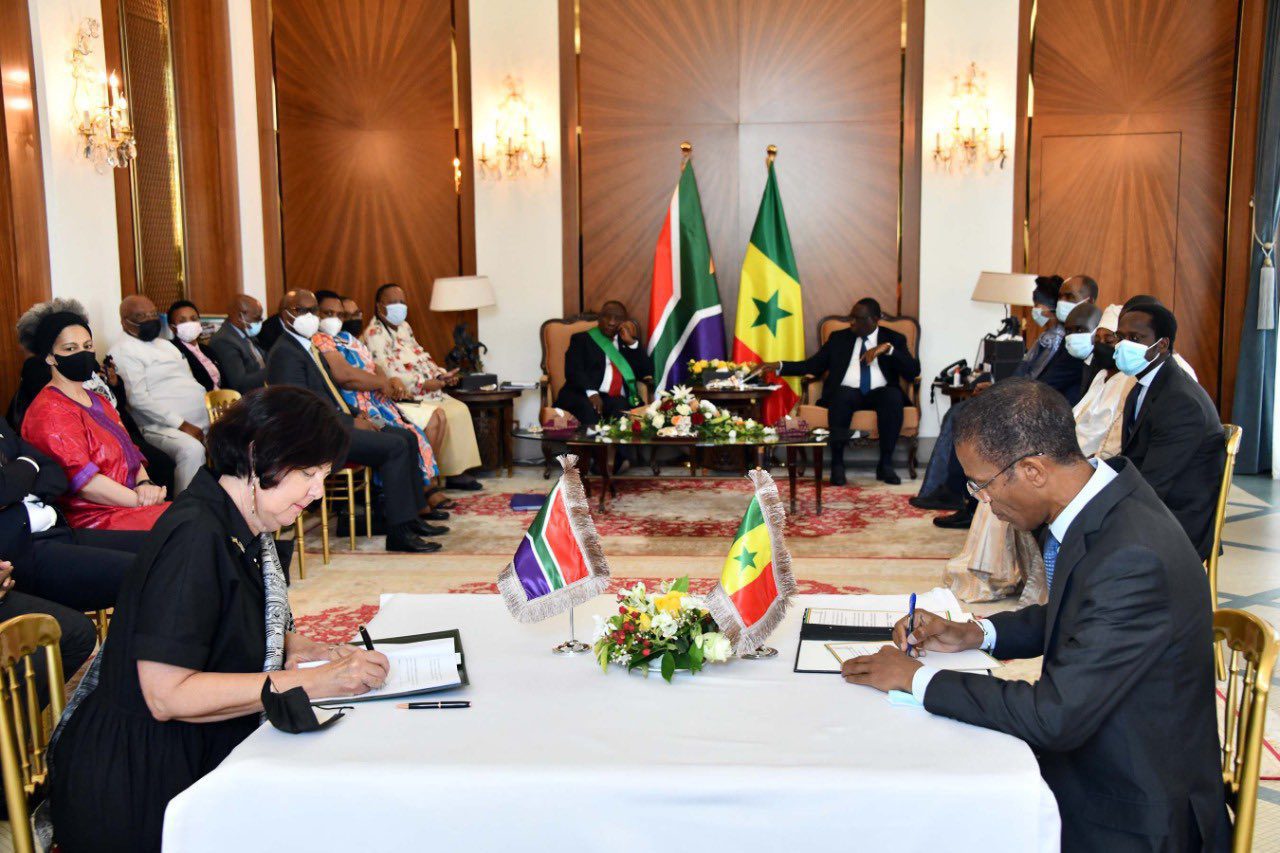 Le Président sud-africain @CyrilRamaphosa a été reçu ce matin par le Chef de l’Etat @Macky_Sall. Des accords portant sur la mise en place d'une commission Mixte, des consultations politiques et la coopération dans les domaines de la pêche et de l’Aquaculture ont été signés. pic.twitter.com/iYlE7C6a5s