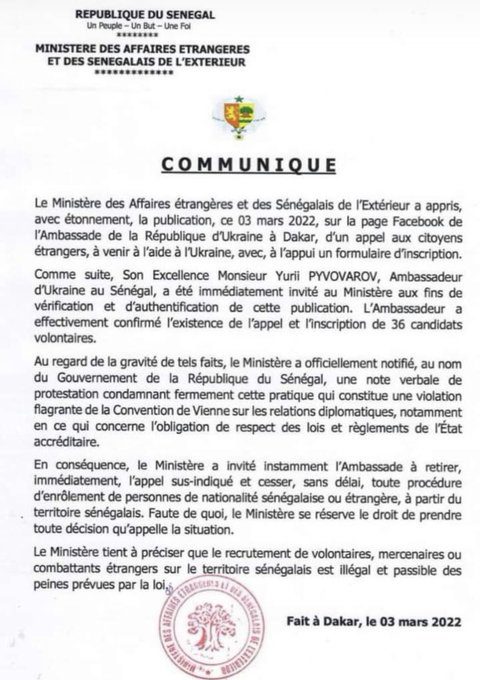 Le Sénégal a transmis ce jeudi à l’ambassadeur de l’Ukraine une «note verbale de protestation» aujourd’hui. Cette vive protestation de l’Etat du Sénégal fait suite à la publication sur les réseaux sociaux notamment sur Facebook un formulaire d’inscription faisant appel aux citoyens étrangers, à venir à l’aide à l’Ukraine.
