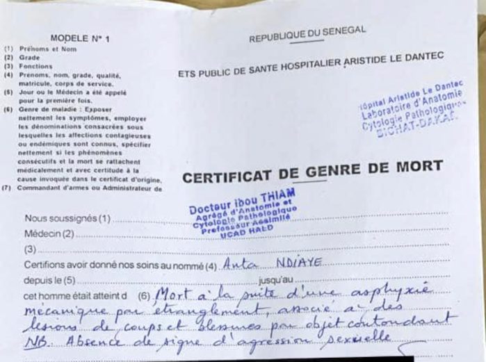 Selon les constations médicales réalisées lors de l’autopsie à l’hôpital Aristide Le Dantec de Dakar, « la fillette A. Ndiaye est décédée « à la suite d’une asphyxie mécanique par étranglement associé à des lésions de coups et blessures par objet contondant » tout en écartant « l’absence de signe d’agression sexuelle ».