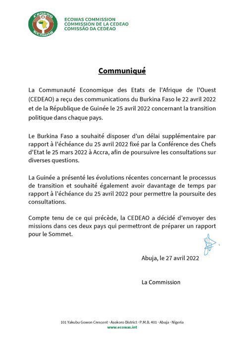 La Communauté Economique des Etats de l’Afrique de l’Ouest (CEDEAO) a reçu des communications du Burkina Faso le 22 avril 2022 et de la République de Guinée le 25 avril 2022 concernant la transition politique dans chaque pays.