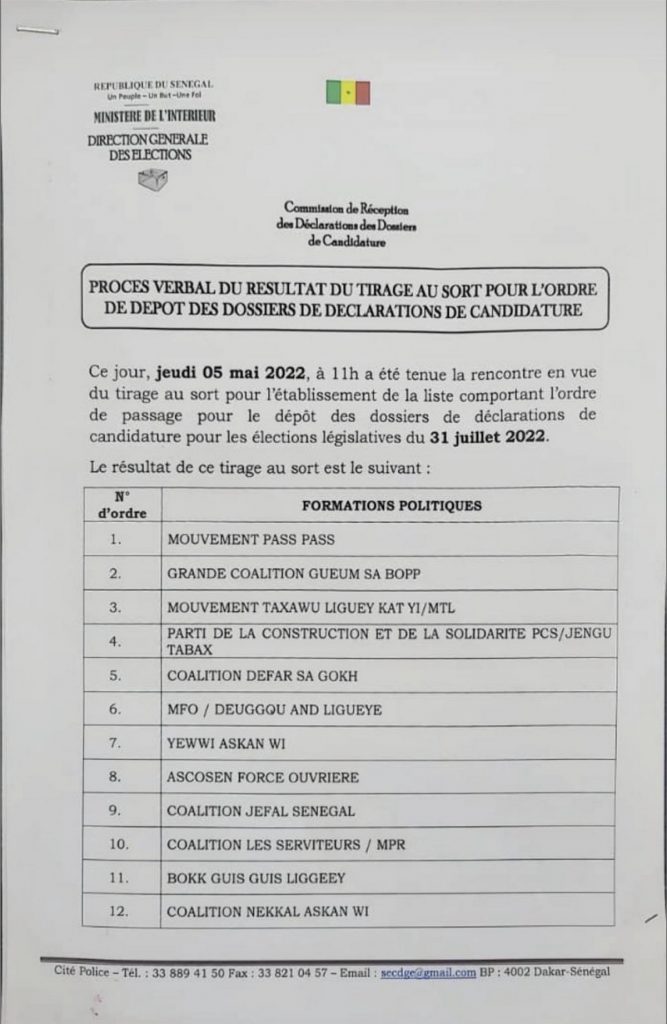 La direction générale des élections et les partis politiques et coalitions de partis sont en plein préparatifs des élections législatives du 31 juillet 2022. Ce jeudi par tirage au sort, la direction générale des Élections a établi l’ordre de passage pour le dépôt des dossiers de déclaration de candidature en vue des élections législatives du 31 juillet 2022. Le tirage au sort s’est tenu à huis clos à la DGE loin du regard des journalistes selon Dakar Actu, mais en présence des membres de la société civiles et des acteurs politiques en lice.