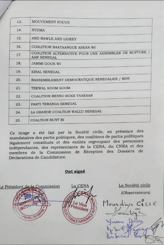 Selon le communiqué du ministère de l’Intérieur et de la sécurité publique « «Ce tirage a été fait par la société civile, en présence des mandataires des partis politiques, des coalitions de partis politiques légalement constitués et des entités regroupant des personnes indépendantes, des représentants de la Cena, du Cnra et des membres de la Commission de réception des dossiers de déclarations de candidature. »