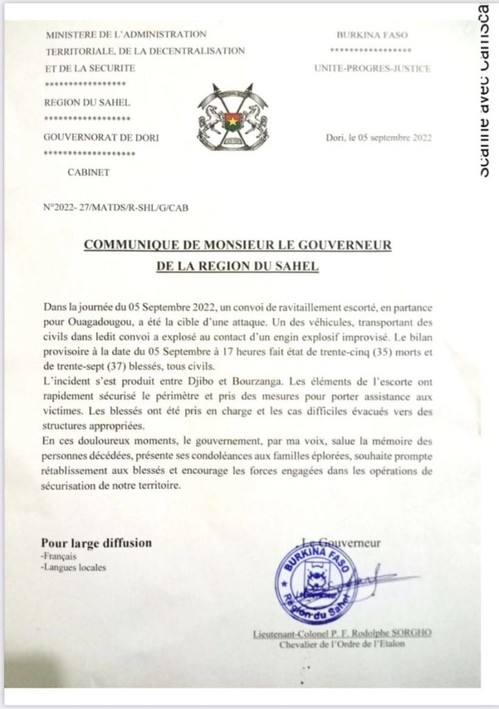 Il faisait partie d’un convoi de ravitaillement qui partait à Ouagadougou. Il était escorté par les forces de défense et sécurité. 37 autres personnes ont été blessées et transportées dans les centres de santé selon le gouverneur, le lieutenant-colonel Rodolphe Sorgho.