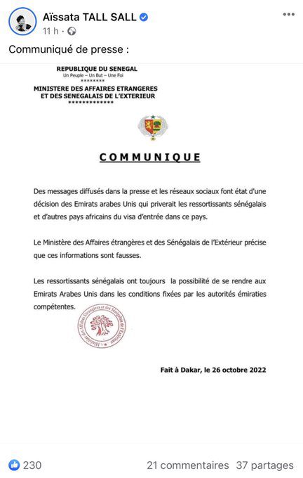 Dans un communiqué rendu public le ministères des Affaires étrangères apporte des précisions « des messages diffusés dans la presse et réseaux sociaux font état d’une décision des Emirats arabes Unis qui priverait les ressortissants sénégalais et d’autres pays africains du visa dans ce pays. Ces informations sont fausses », précise le Ministère des Affaires étrangères.
