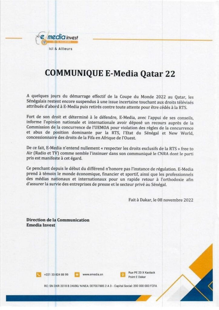 Fort de son droit et déterminé à le défendre, E-Media, avec l’appui de ses conseils, informe l’opinion nationale et internationale avoir « déposé un recours auprès de la Commission de la concurrence de l’UEMOA pour violation des règles de la concurrence et abus de position dominante par la RTS, l’Etat du Sénégal et New World concessionnaire des droits de la Fifa en Afrique de l’Ouest ».