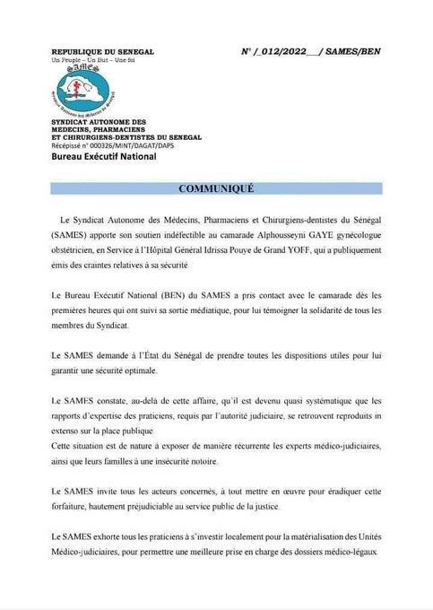 Le Syndicat autonome des médecins du Sénégal (SAMES) apporte son soutien indéfectible au médecin gynécologue obstétricien Dr Alphousseyni Gaye de l’hôpital général Idrisssa Pouye de Grand Yoff qui a publiquement émis des craintes relatives à sa sécurité depuis son rapport sur l’affaire « Sweet Beauty » concernant le leader politique Ousmane Sonko et son accusatrice Adji Sarr.