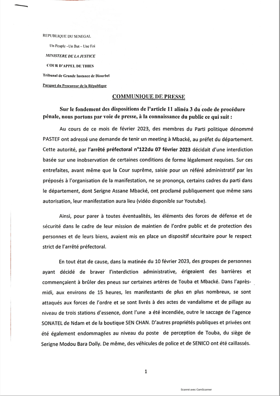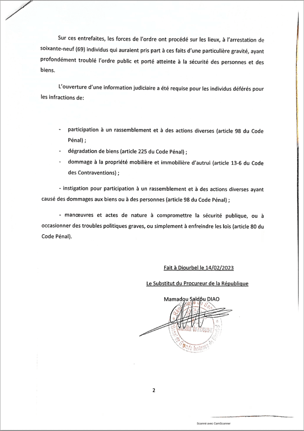 Le procureur de la République près le Tribunal de Grande Instance de Diourbel a requis l’ouverture d’une information judiciaire suite à l’arrestation de soixante-neuf (69) individus lors des affrontements de vendredi dernier entre jeunes et forces de sécurité à Mbacké.
