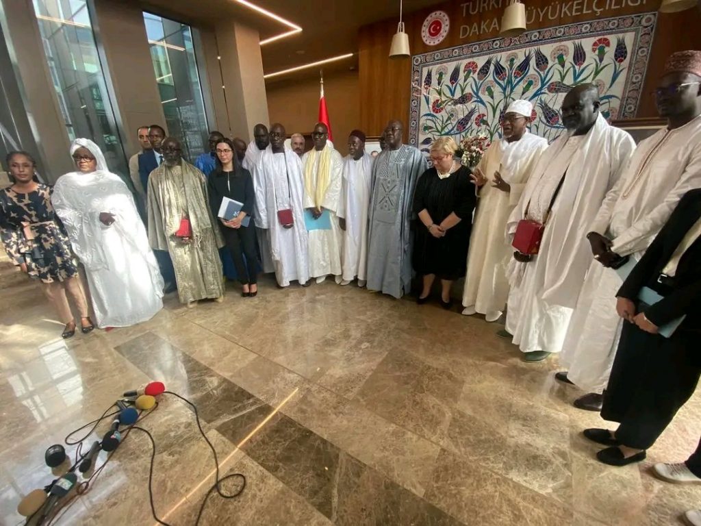 Délégation du Khalif Général des Mourides Serigne Mountakha Mbacke Bachir à l’ambassade de Turquie à Dakar, pour la remise d’un chèque de 100millions de F CFA, soit 3 millions de livre turc en aide aux victimes des séismes.
