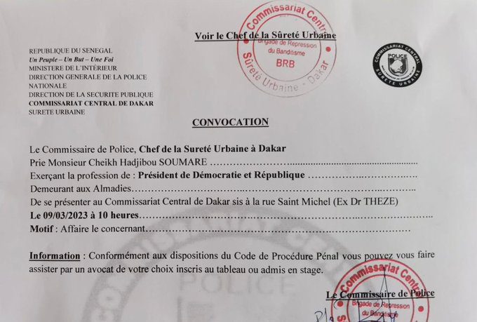 L’ancien Premier ministre sous le régime de Me Abdoulaye Wade Cheilkh Hadjibou Soumaré (19 juin 2007-30 avril 2009) Cheikh Adjibou Soumaré est attendu à la Sûreté urbaine de Dakar, ce jeudi à 10 heures pour affaire le concernant, renseigne un communiqué de la Police.