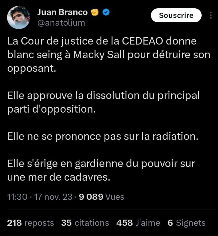 La Cour de justice de la CEDEAO donne blanc seing à Macky Sall pour détruire son opposant.