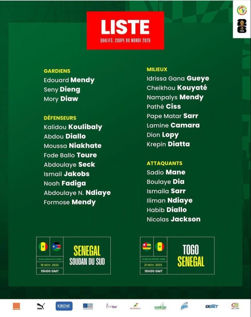 Aliou Cissé a dévoilé ce vendredi 10 novembre la liste des joueurs retenus pour le match contre le Soudan du Sud prévue le 18 novembre et le 21 novembre contre le Togo. Deux matchs comptant pour la première journée des éliminatoires de la Coupe du Monde 2026.