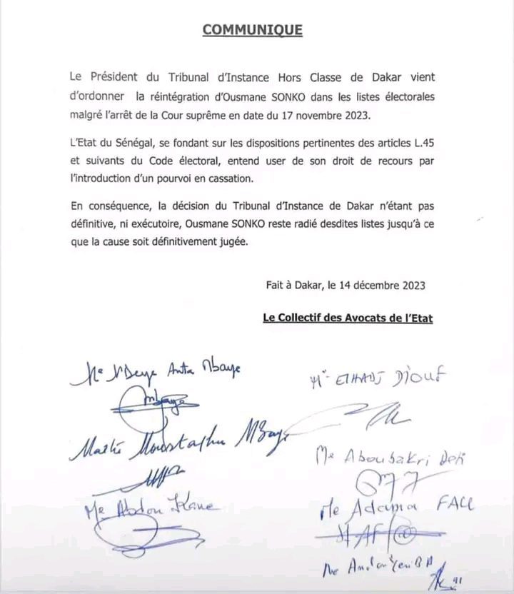 « Le président du tribunal d’Instance hors classe de Dakar vient d’ordonner la réintégration d’Ousmane Sonko dans les listes électorales malgré l’arrêt de la Cour suprême en date du 17 novembre 2023.L’État du Sénégal, se fondant sur les dispositions pertinentes des articles L.45 et suivants du Code électoral, entend user de son droit de recours par l’introduction d’un pourvoi en cassation. En conséquence, la décision du tribunal d’instance de Dakar n’étant pas définitive ni exécutoire, Ousmane Sonko reste radié desdites listes jusqu’à ce que la cause soit définitivement jugée « .