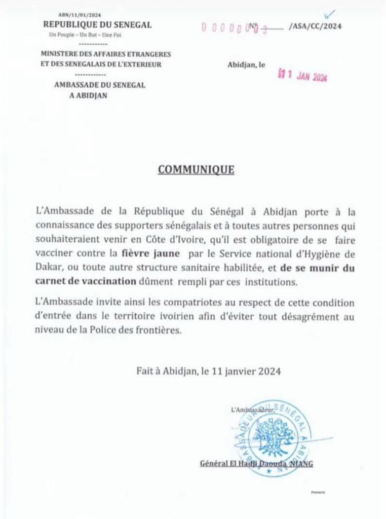 A l’attention des supporers sénégalais qui désirent se rendre en Côte d’Ivoire, l’Ambassade du Sénégal à Abidjan demande à ceux qui veulent se rendre en Côte d’Ivoire pour suivre la Coupe d’Afrique des Nations (CAN) de se vacciner contre la Fièvre Jaune. C’est une des conditions pour entrer dans le territoire ivoirien. L’annonce est faite par l’Ambassade du Sénégal à Abidjan, à travers un communiqué.