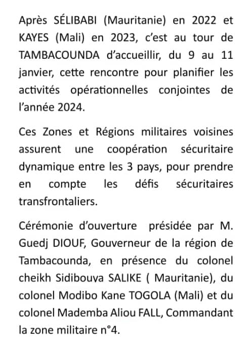 La région de Tambacounda abritant la Zone militaire numéro 4 accueille la réunion annuelle tripartite Sénégal, Mali et Mauritanie, ce depuis le mardi 9 janvier au jeudi 11 janvier.