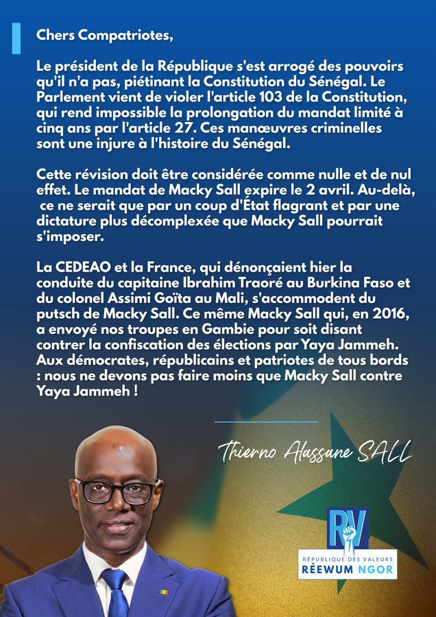 Le président du parti la République des Valeurs et candidat à la présidentielle Thierno Alassane Sall a fait un post musclé contre le président Macky Sall, a qui il reproche d’avoir violé la constitution mais pour l’ancien ministre de l’Energie « cette révision doit être considérée comme nulle et de nul effet. Le mandat de Macky Sall expire le 2 avril. »