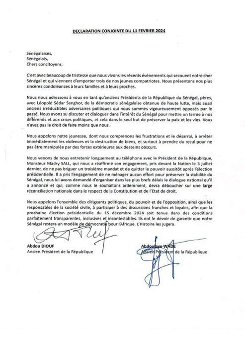 Sénégal : Les deux anciens présidents de la République du Sénégal Abdou Diouf (1981-2000) et Abdoulaye Wade (2000-2012) ont appelé dans la jeunesse sénégalaise à faire cesser la violence mais aussi la classe politique et les forces vives de la nation à répondre à l’appel au dialogue lancé par le Président Macky Sall afin d’aller vers des élections inclusives, apaisées du 15 décembre.