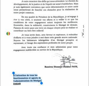 « En cette période charnière de notre histoire, où chaque pas vers l’avenir se dessine sous le signe de la promesse et de l’espoir, il m’est apparu essentiel de m’adresser directement à vous, femmes et hommes dévoués au service de notre nation. Vous constituez sans nul doute la colonne vertébrale de notre administration et le cœur battant de notre pays », a-t-il écrit aux fonctionnaires et agents de l’administration du Sénégal.